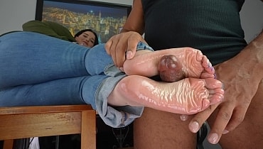 Indulging in Fiesty Snowbunny's soft wrinkled soles ought to be at the top of your priorities. Her thick meaty feet are a pleasure to stare at. The wrinkles that line up across her shapely soles are such a pleasure to look at and she makes sure she places them close to your face so you can see them up close in detail. The tender sensation of her flesh feels incredible as you grab her ankles and slide your dick between her feet. She turns to the side and wrinkles her feet up while your dick slides between her arches until you release your pent up cumshot.