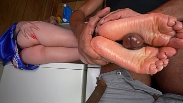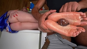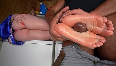 After she finishes her chores, Hailey sits atop the washing machine in nothing but a night gown. Her feet are absolutely filthy from working around the basement with no shoes on. You notice that her feet are so dirty and offer to clean them. Once all the grime and grit is removed, the sight of her flawless soles are irresistible. Just holding her ankles by hand gets you stiff. After pressing them against your crotch, the only thing left to do is use them to satisfy yourself as she looks on, longingly, with her titties hanging out.